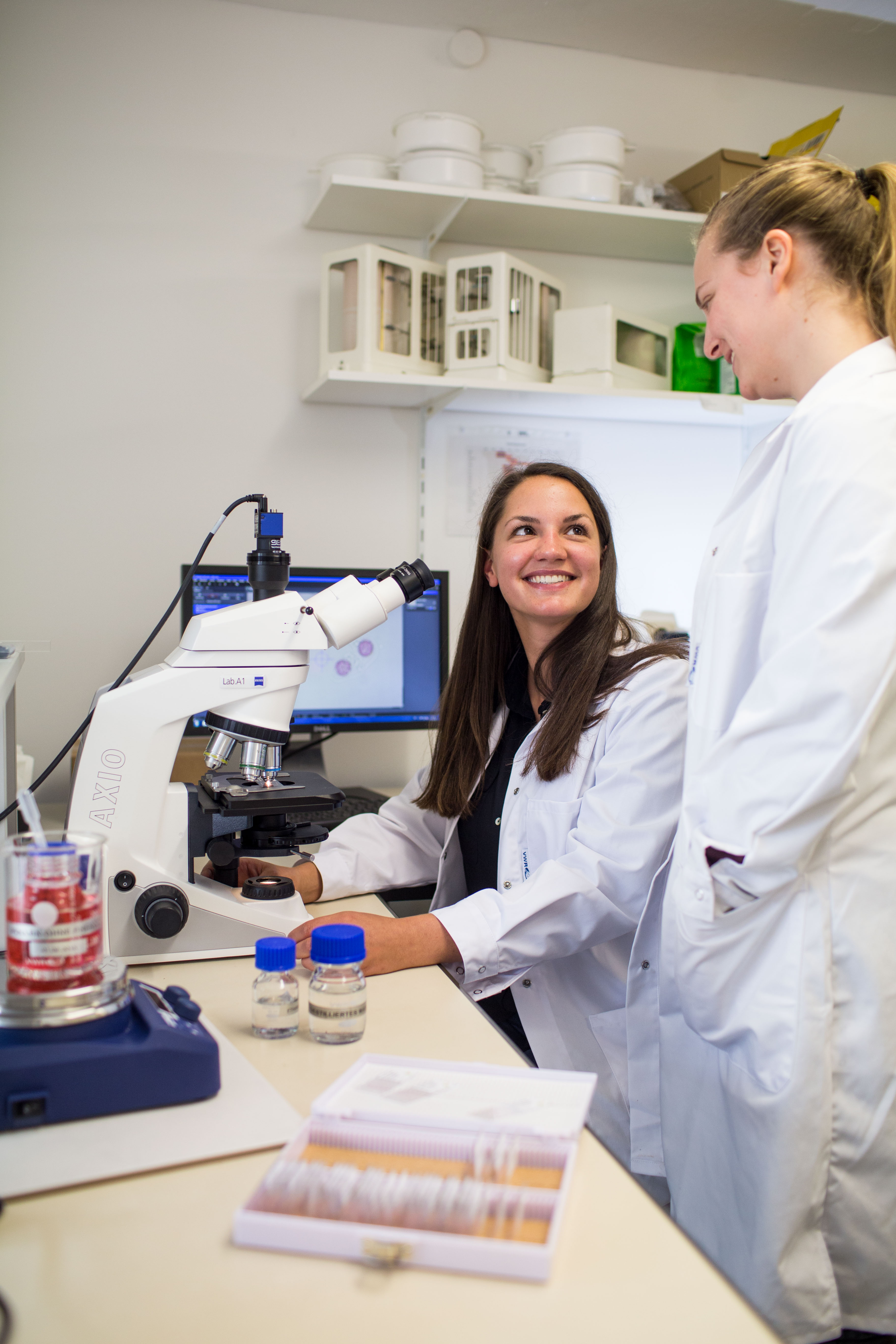 Die Studentinnen Johanna Jetschni (links) und Sara Hocheder untersuchen im Labor des Fachbereichs Geographie der Katholischen Universität Eichstätt-Ingolstadt für ein Forschungsprojekt Blütenpollen mit einem Mirkoskop. Die Pollen werden mit einer speziellen Pollenfalle auf dem Campus in Eichstätt gesammelt.