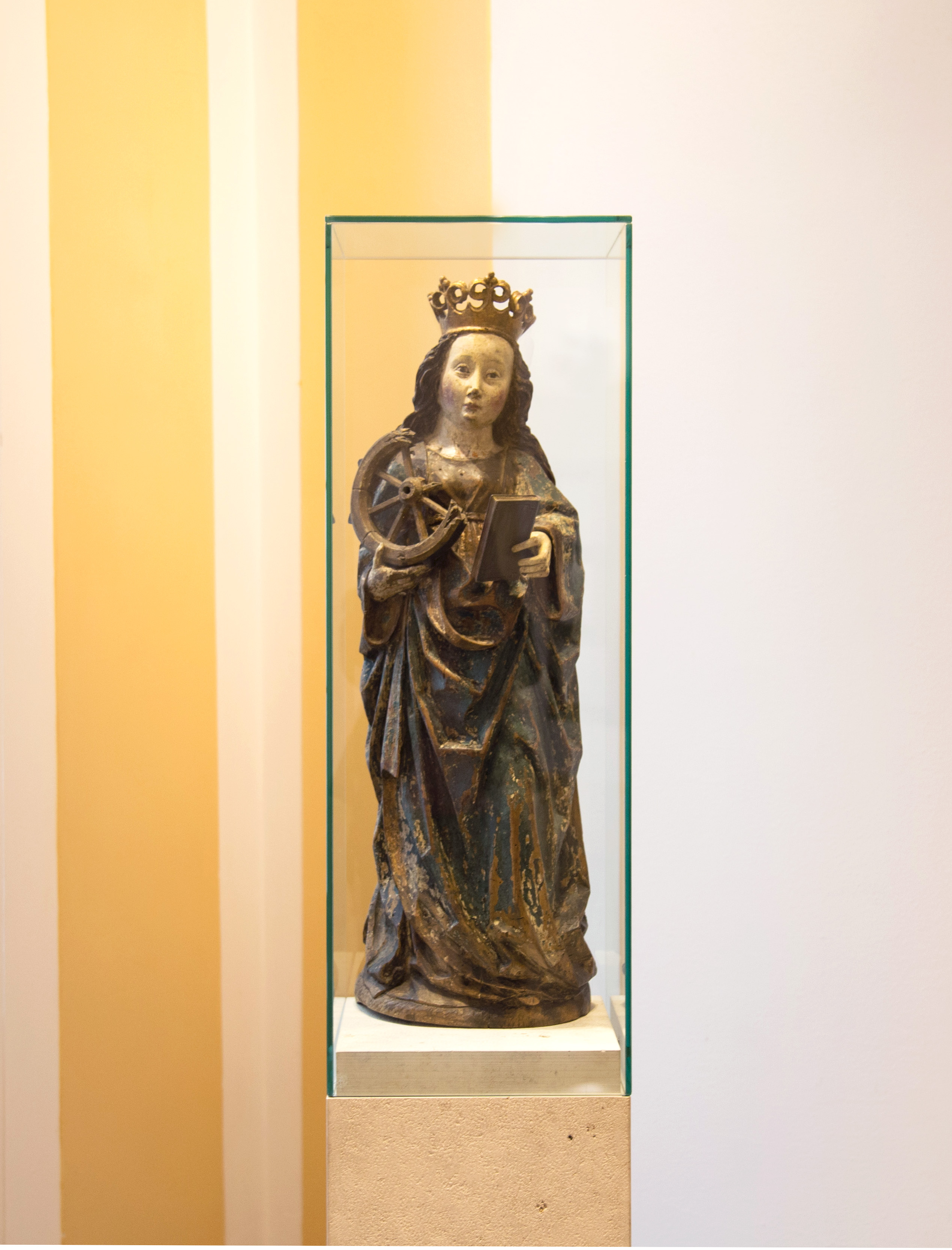 Statue der Heiligen Katharina in der Sommerresidenz in Eichstätt. Die Heilige Katharina von Alexandrien gehört zu den vierzehn Nothelfern. Sie ist die Schutzpatronin der Philosophen und heute Patronin der Katholischen Universität Eichstätt-Ingolstadt. Die Statue, die im 15. Jahrhundert – wahrscheinlich um 1480 – in Süddeutschland entstanden ist, wurde auf Initiative des Magnus Cancellarius, des Vorsitzenden des Stiftungsvorstands und der Hochschulleitung beschafft. Die Kathari...    »