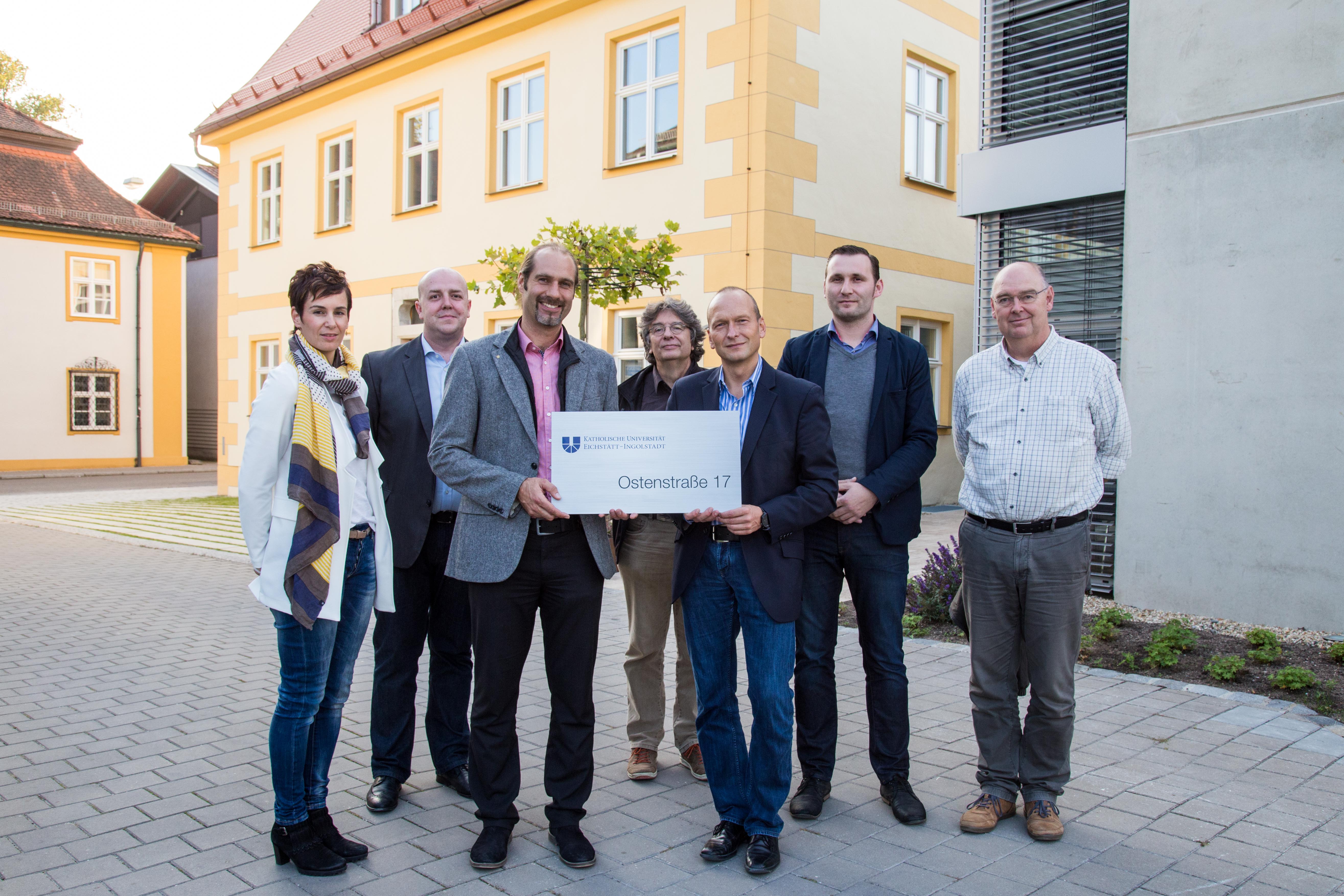 Übergabe des sanierten Gebäudes an die Katholische Universität Eichstätt-Ingolstadt. Von links Elisabeth Frey, KU-Facilitymanager Alexander Würth, Investor und Hausbesitzer Josef Frey jun., Architekt Johannes Steinhauser, KU-Kanzler Thomas Kleinert, KU-Gebäudemanager Stefan Wenzel und Architekt Michael Hajek