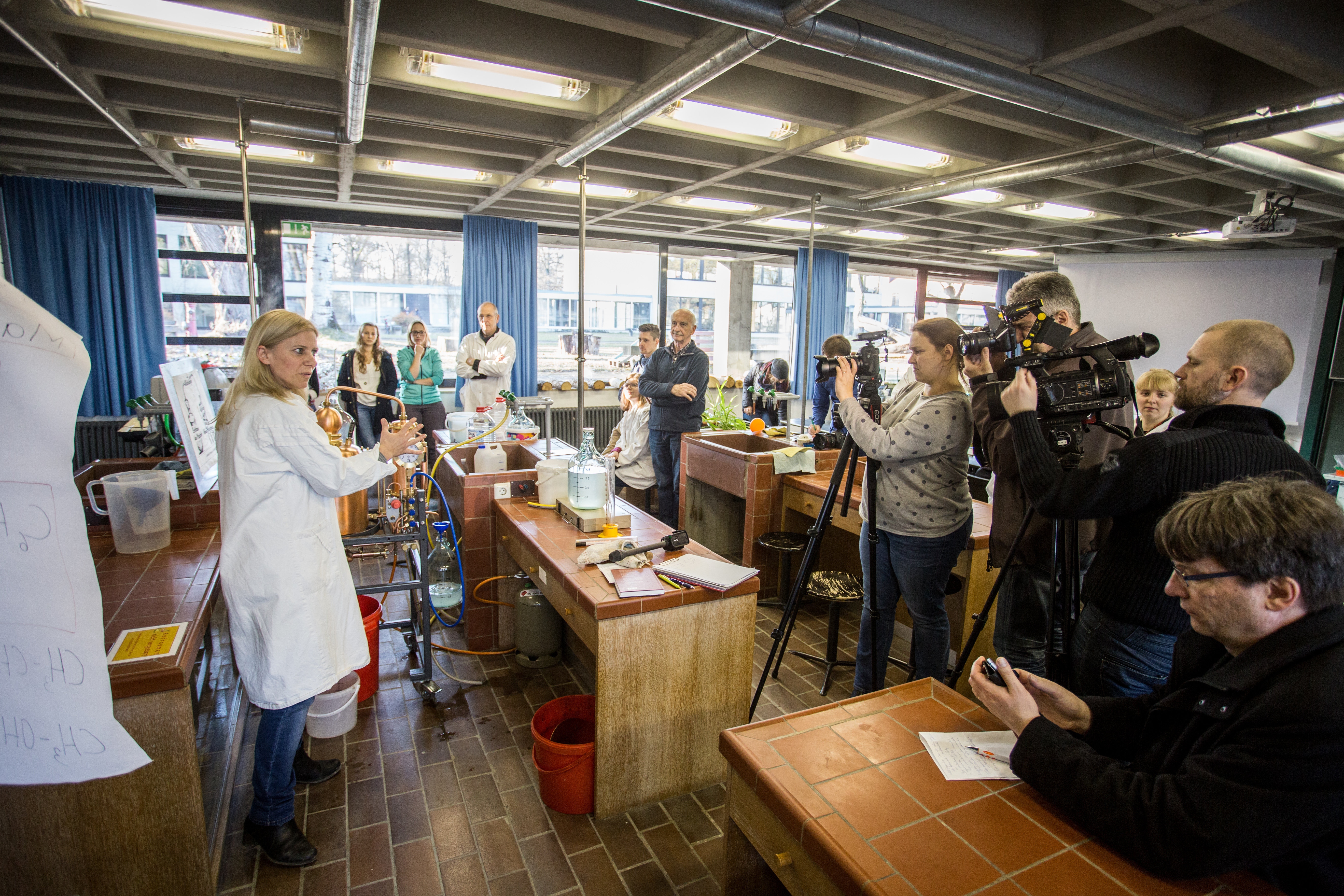 Im Rahmen einer Lehrverstaltung des Faches Didaktik der Biologie nimmt die Katholische Universität Eichstätt-Ingolstadt am 16. Februar 2017 eine Schnapsdestillerie in Betrieb. Studierende erfahren in dem Seminar, wie aus den Zwetschgen des unieigenen Kapuzinergartens ein 40-prozentiger Schnaps entsteht. Für das Obstbrennen hat das Zollamt der KU eine Genehmigung erteilt. Im Bild Biologie-Dozentin Dr. Helga Rolletschek, die vor Journalisten den Prozess des Schnapsbrennens erklärt.