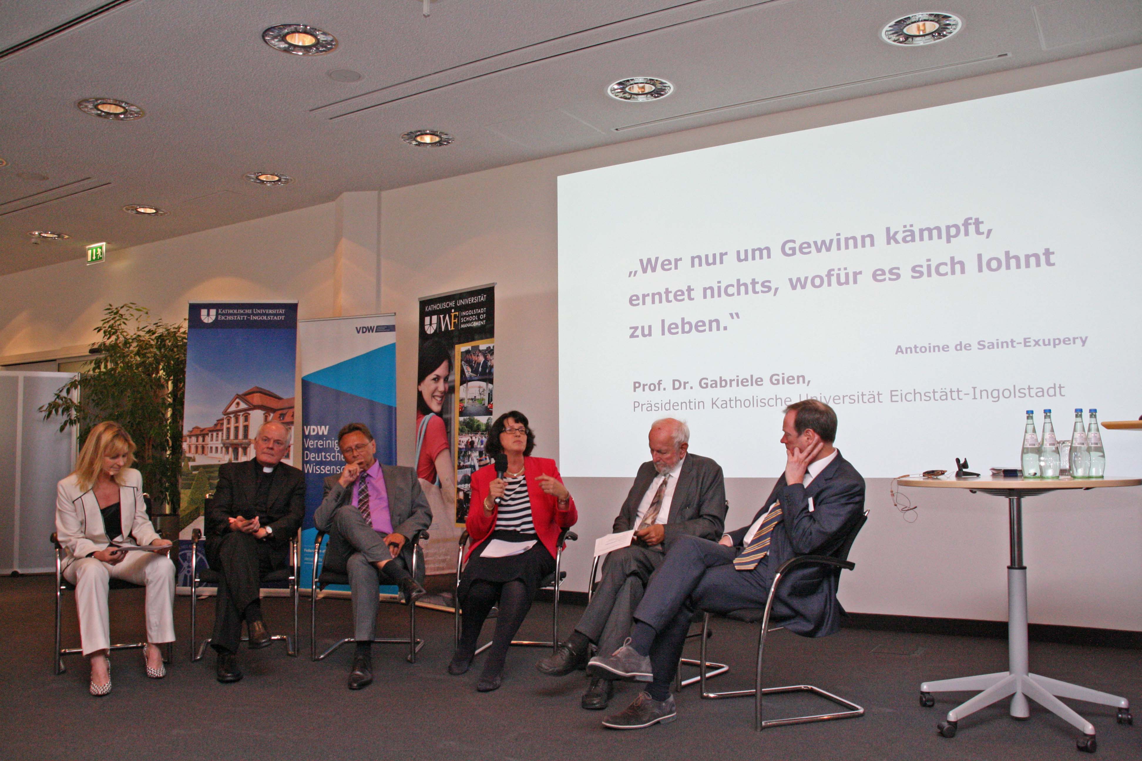 Prof. Dr. Ernst-Ulrich von Weizsäcker, Co-Präsident des Club of Rome, war Hauptredner einer Veranstaltung der Katholischen Universität Eichstätt-Ingolstadt, die seit geraumer Zeit gemeinsam mit der Vereinigung Deutscher Wissenschaftler die Impulse der päpstlichen Enzyklika „Laudato Si‘“ ergründet. (v.l.) Moderatorin Maria Reinisch, Weihbischof Dr. Dr. Anton Losinger, Dr. Klaus Schmid (Vorstandsmitglied der Vereinigung Deutscher Wissenschaftler), Prof. Dr. Gabriele Gien (Präsidentin der KU), Prof. Dr. Ernst Ulrich von Weizsäcker (Co-Präsident des Club of Rome) und Dr. Thomas Pyhel (stellvertretender Leiter der Abteilung „Umweltkommunikation und Kulturgüterschutz“ bei der Deutschen Bundesstiftung Umwelt).
