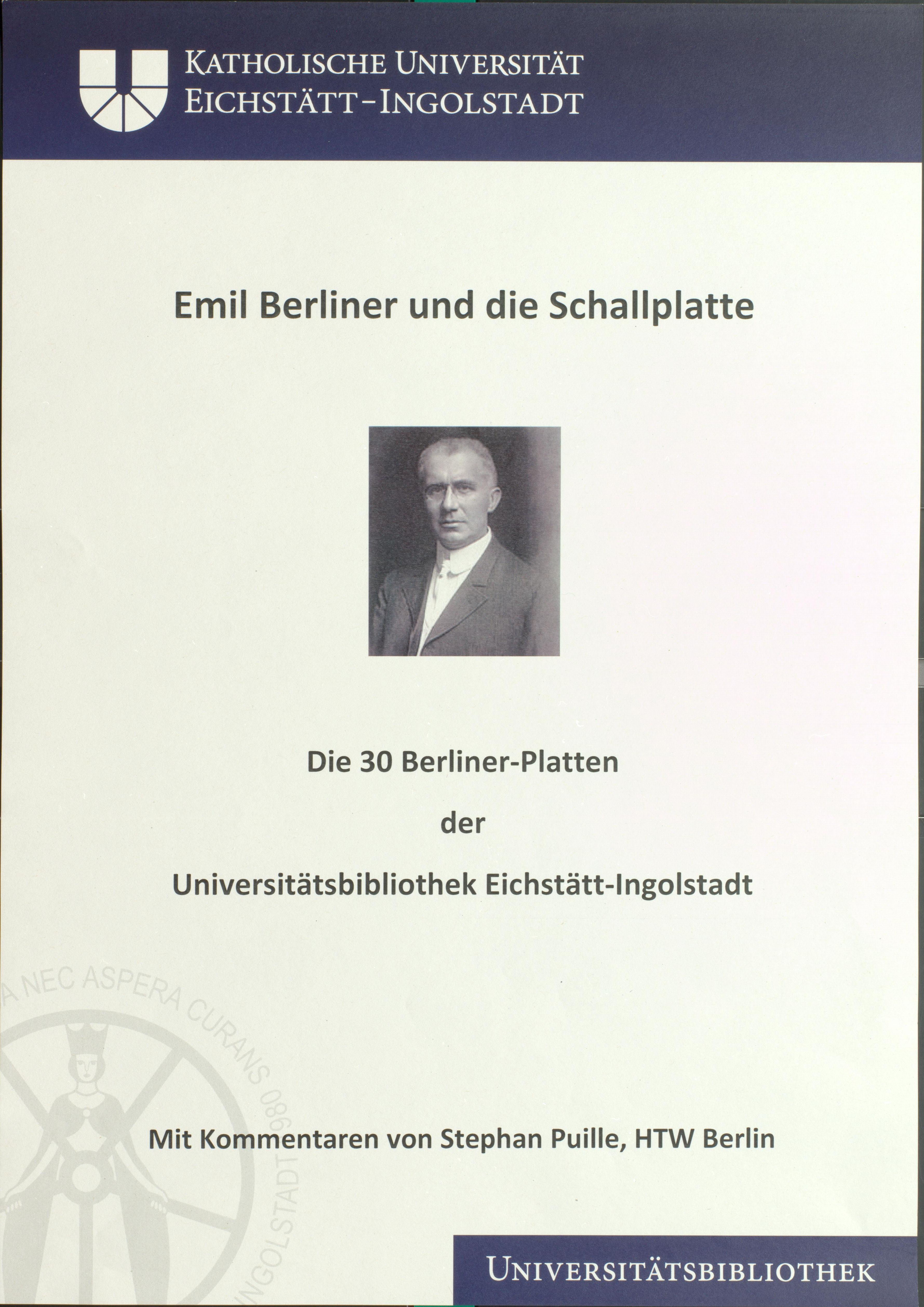 Ausstellungsmaterial zur Ausstellung "Emil Berliner und die Schallplatte. Die 30 Berliner-Platten der Universitätsbibliothek Eichstätt-Ingolstadt" - Gezeigt von April 2017 bis 14.12.2017 in der Hofgartenbibliothek der UB Eichstätt-Ingolstadt. - 1 Plakat, Beschriftungen und Tafeln mit Kommentaren u.a. von Stephan Puille, HTW Berlin. - MIT DIGITALAUFNAHME