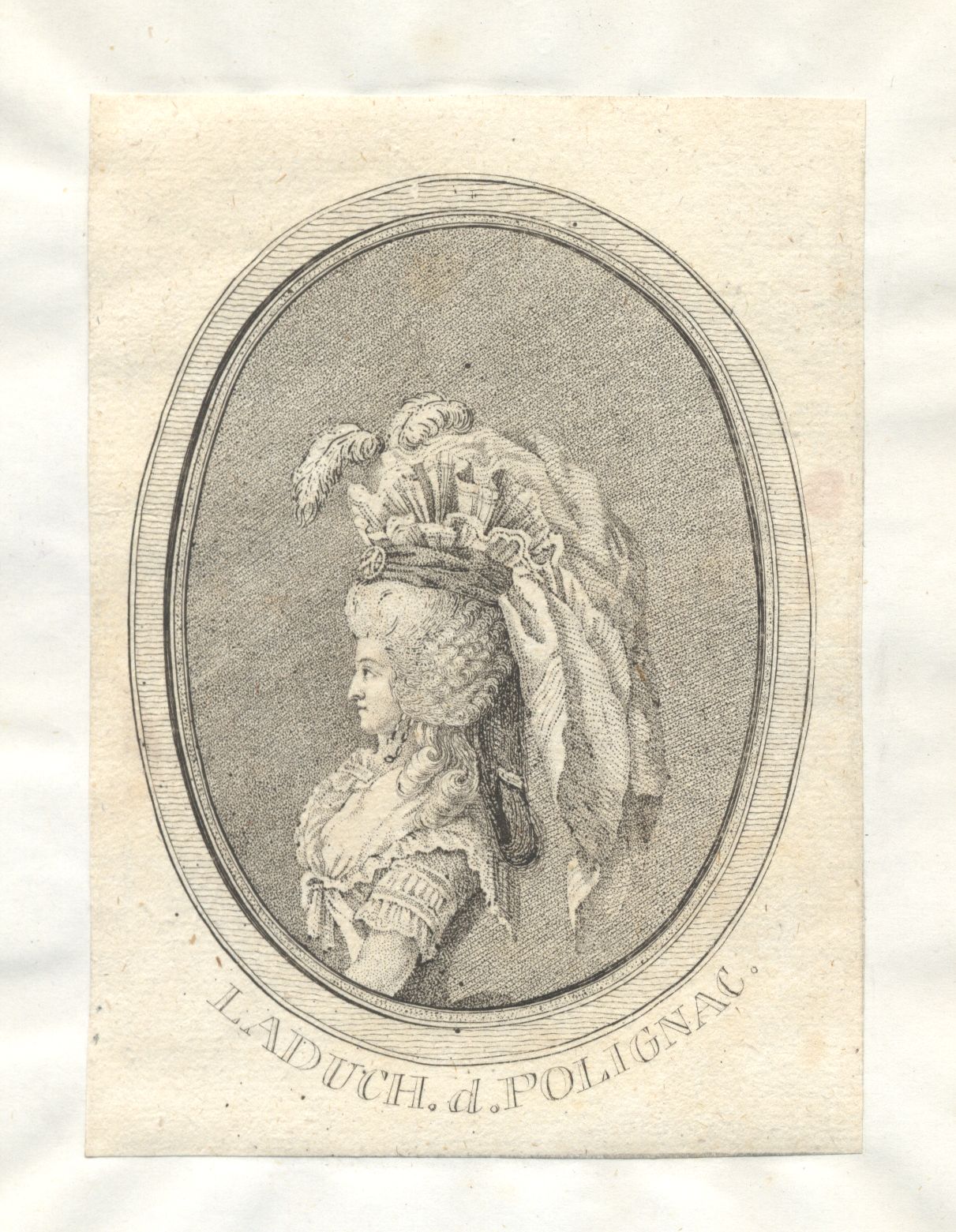 Punktiermanier, Kupferstich und Radierung; 8,4 x 6,2 cm (im Oval) bzw. 9,6 x 7,4 cm (gesamtes Oval). - Plattenrand beschnitten, leicht fleckig. - Auf Papier aufgeklebt. - MIT DIGITALAUFNAHME