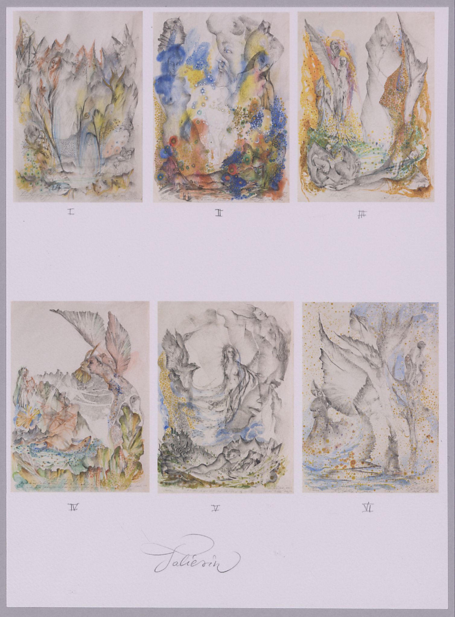Farbdrucke; je ca. 68,5 x 49 cm (Bild) bzw. 76,5 x 57 cm (Blatt). - Auf der Rückseite abgedruckt die entsprechenden handschriftlichen Liedtexte außer bei Blatt IV (leere Rückseite). - Auf dem Übersichtsblatt der Titel handschriftlich mit Bleistift. - MIT DIGITALAUFNAHME