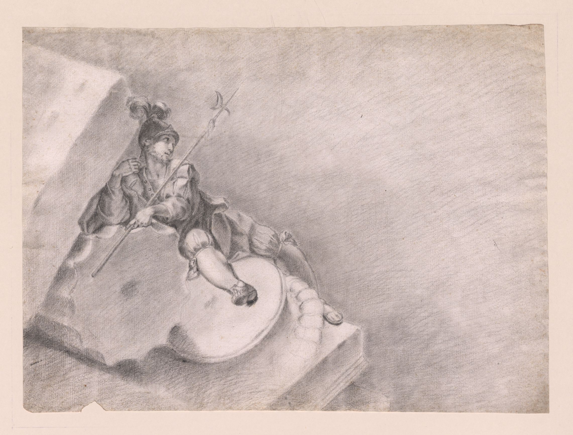 Bleistift; 44 x 32,6 cm (Blatt). - Fehlstelle unten links, kleiner Einriß Mitte links, faltig und stockfleckig. - MIT DIGITALAUFNAHME