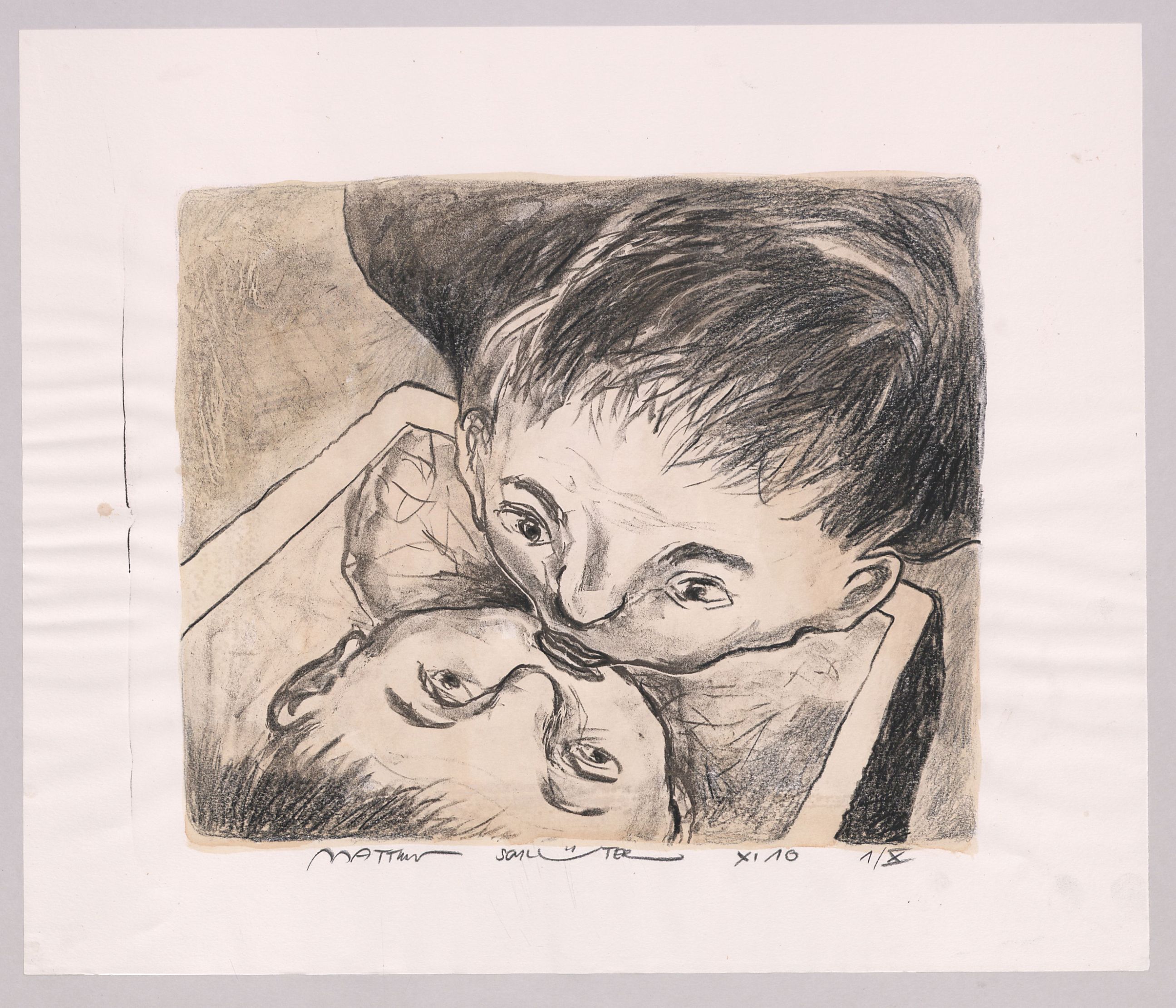 [Jahresdruck 2010 der Lithographie-Werkstatt Eichstätt: Zwei sich küssende Gesichter, von oben gesehen]
