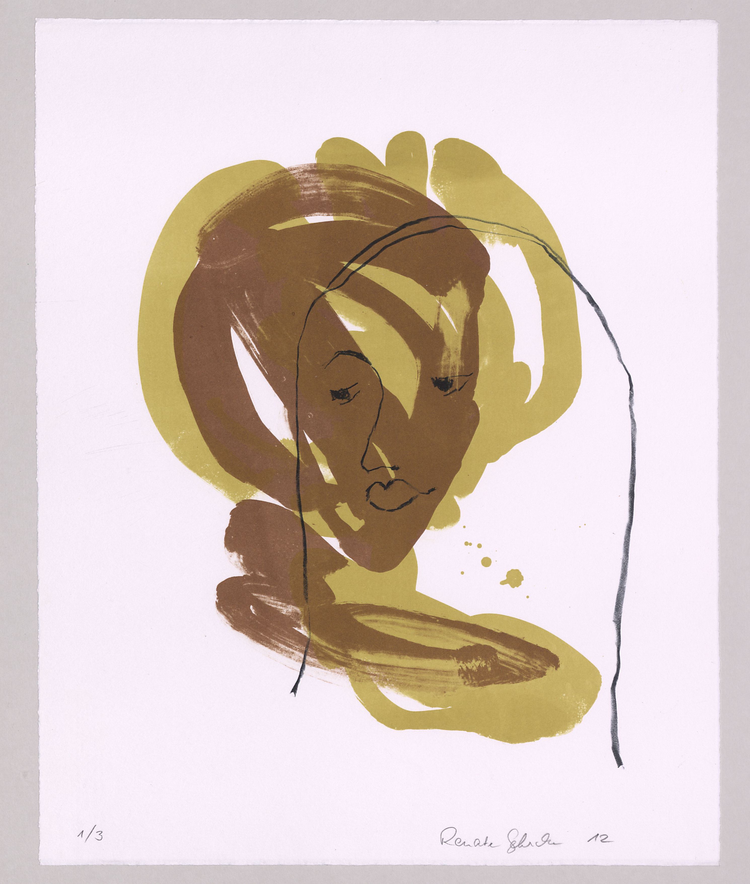 Lithographie (Tusche, Kreide; 3 Farben); ca. 41 x 33,5 cm (Bild) bzw. 56,8 x 45,9 cm (Blatt). - Von der Künstlerin mit Bleistift bezeichnet (auf der Rückseite), datiert, numeriert (1/3) und signiert. - MIT DIGITALAUFNAHME