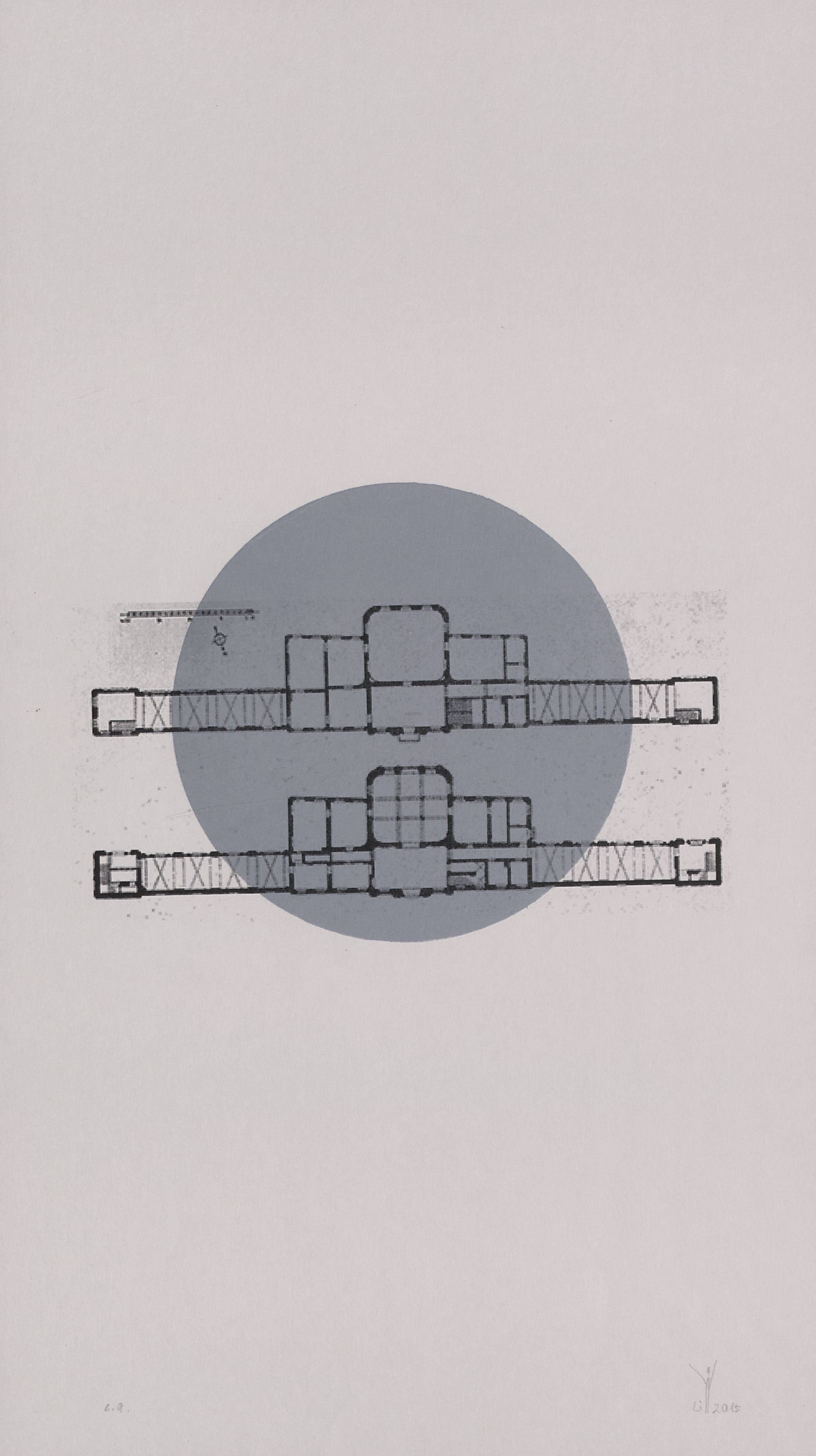 Lithographie (computerbearbeitete Grundrisse, Seifenfeld); ca. 19,5 x 28 cm (Bild) bzw. 62,7 x 35,4 cm (Blatt). - Von der Künstlerin mit Bleistift datiert und signiert. - MIT DIGITALAUFNAHME