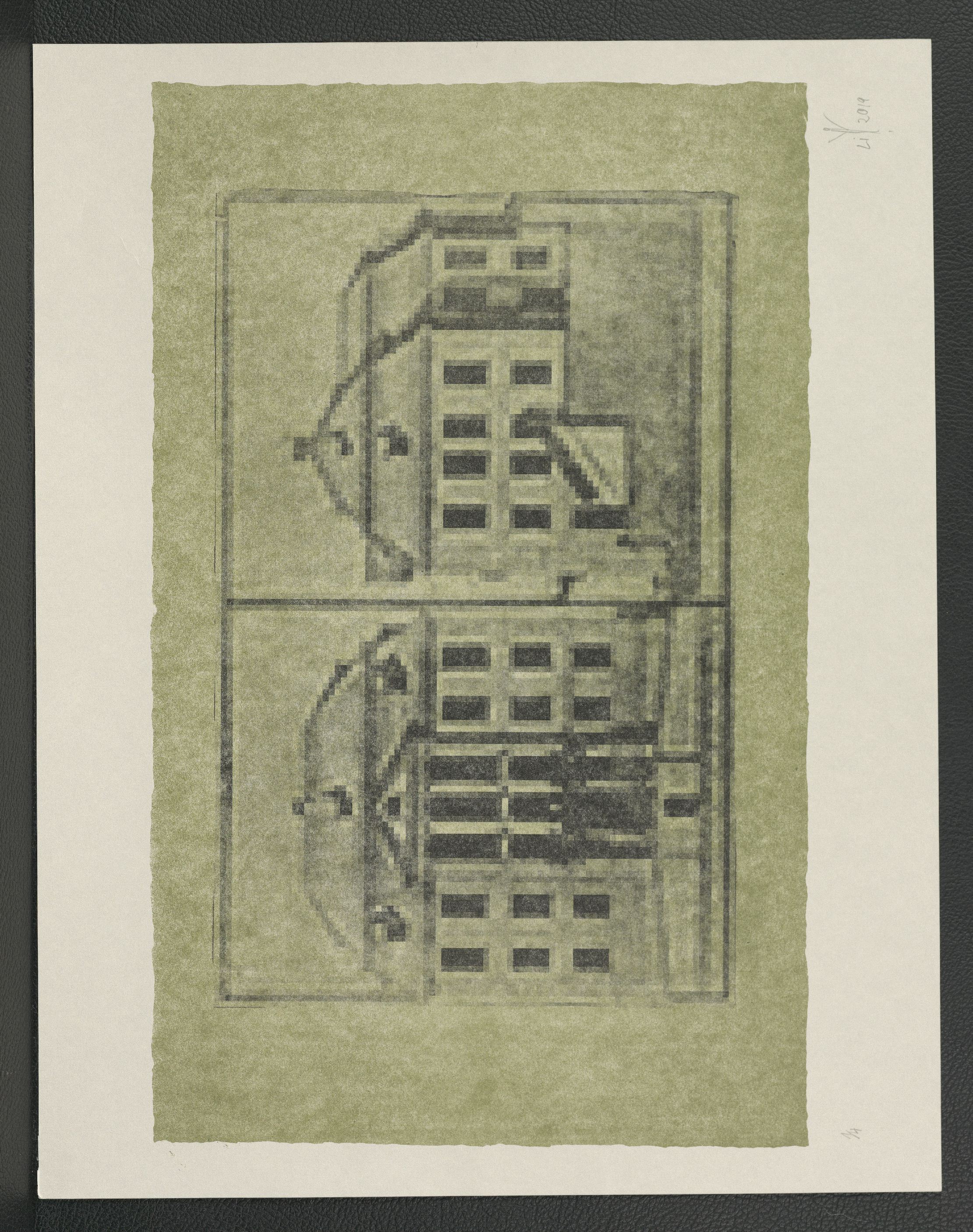 Lithographie (2 Passagen) in schwarz und grün; ca. 26,2 x 42,3 cm (Bild) bzw. 36 x 46 cm (Blatt). - Von der Künstlerin mit Bleistift auf der Rückseite bezeichnet, auf der Vorderseite datiert, numeriert (1/4) und signiert. - MIT DIGITALAUFNAHME (QUERFORMAT!! Kann nur im Vollbild richtig dargestellt werden)