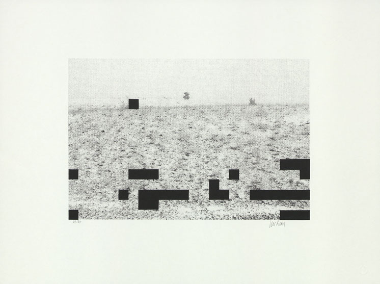 Computerdruck, schwarz-weiß, grob gerastert, mit Lithographie (schwarze Balken) überdruckt; 26,7 x 39,9 cm. - Vom Künstler mit Bleistift numeriert (23/30) und signiert. - MIT DIGITALAUFNAHME