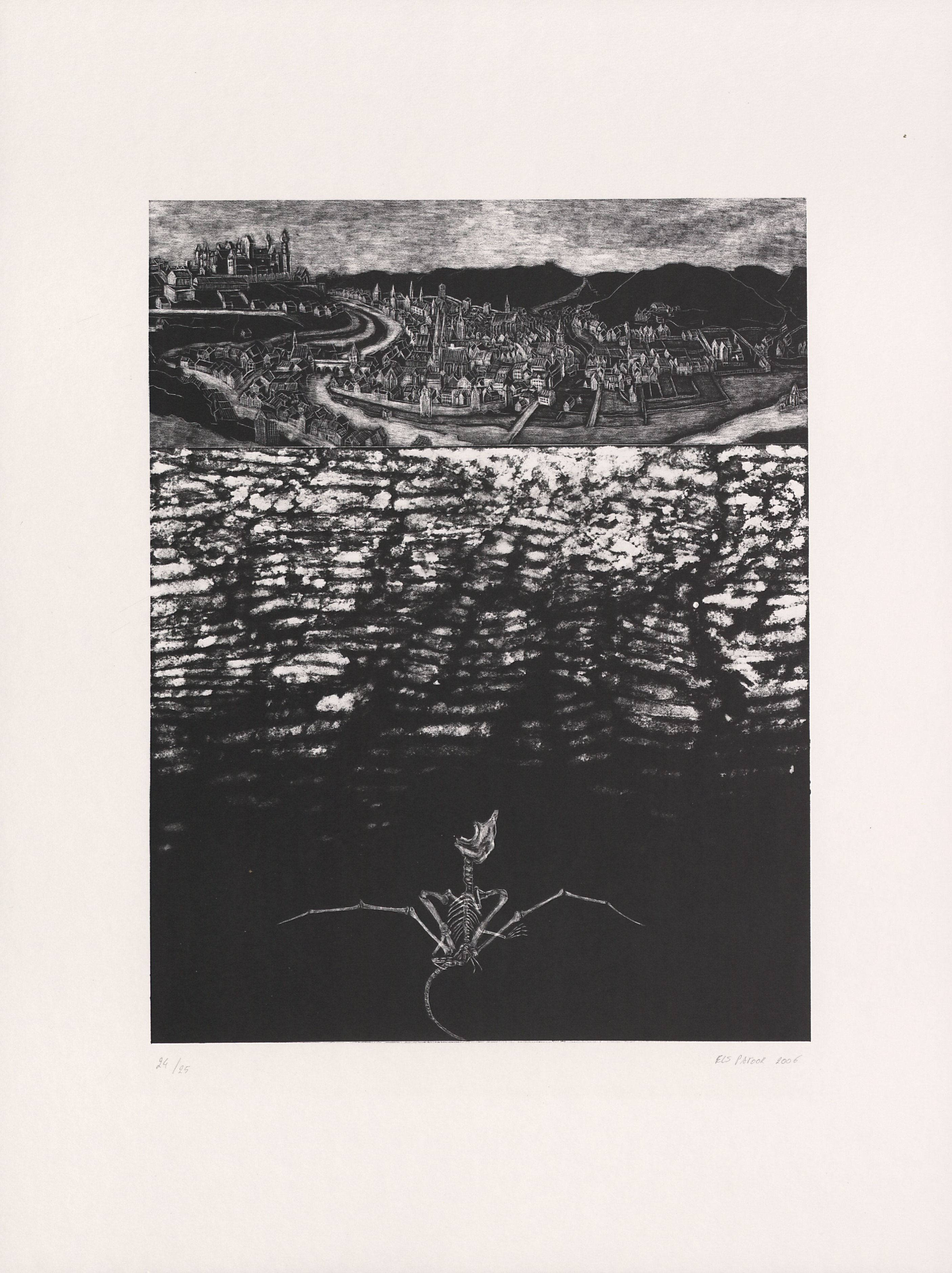 [Jahresdruck 2006 der Lithographie-Werkstatt Eichstätt: Oben eine Ansicht von Eichstätt nach Merian, darunter ein Steinbruch, unter diesem in der Schwärze das Fossil eines Flugsauriers]