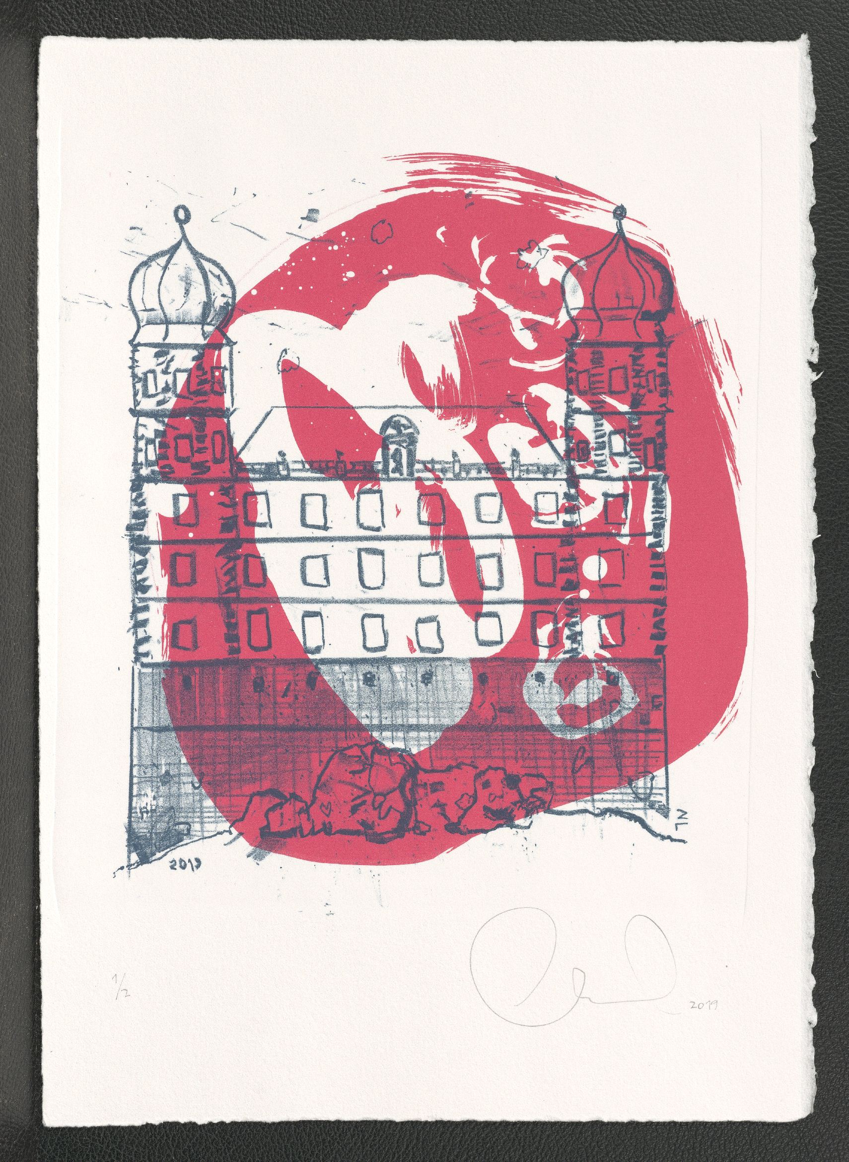 Lithographie, zweifarbig; ca. 25 x 22 cm (Bild) bzw. 37,6 x 26,8 cm (Blatt). - Von der Künstlerin mit Bleistift datiert, numeriert (1/2) und signiert. - MIT DIGITALAUFNAHME