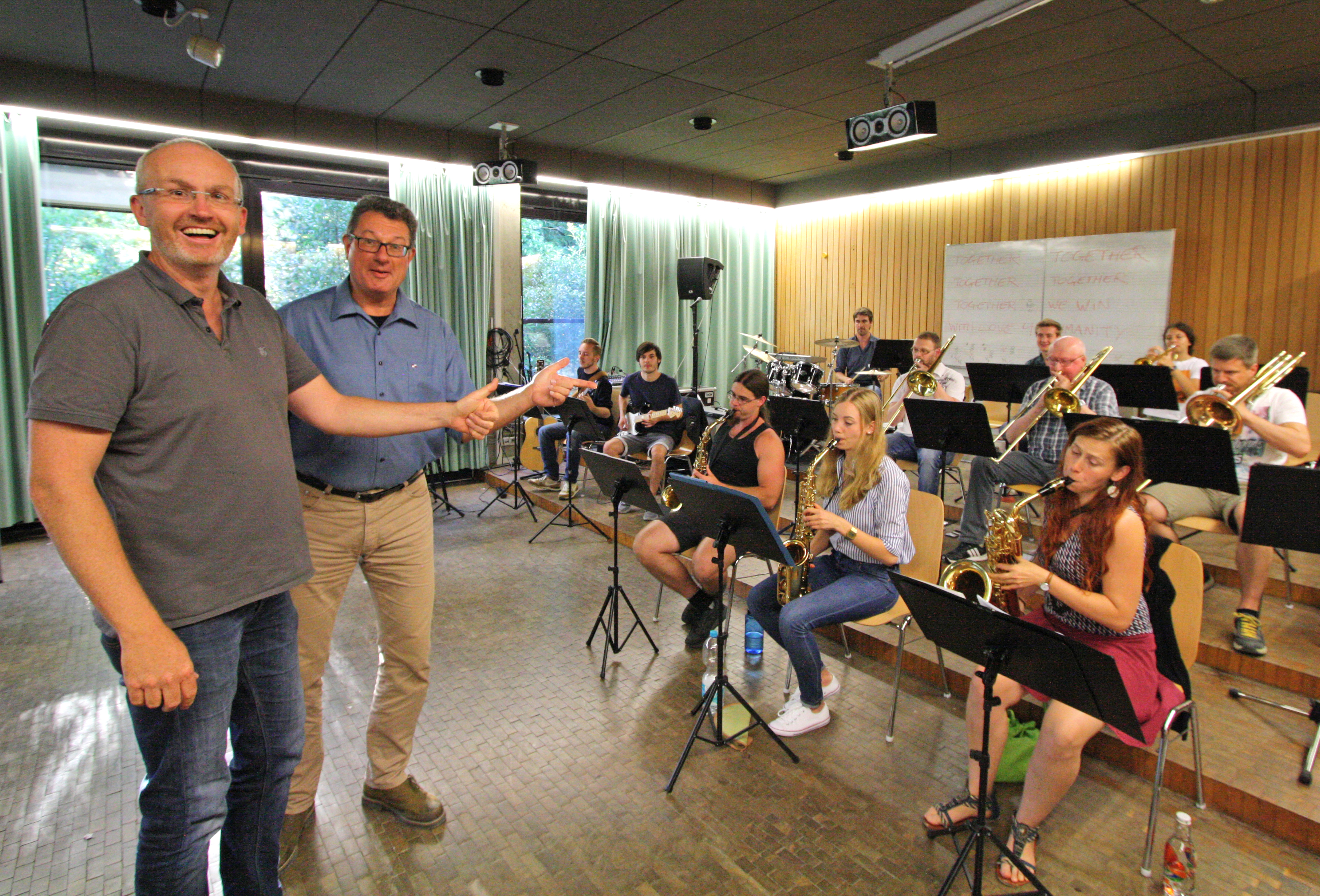 (v.l.) Robert Aichner wird von Jörg Edelmann zum Wintersemester die Leitung der KU-Big Band übernehmen und dann die wöchentlichen Proben leiten. (Foto: Schulte Strathaus/upd)