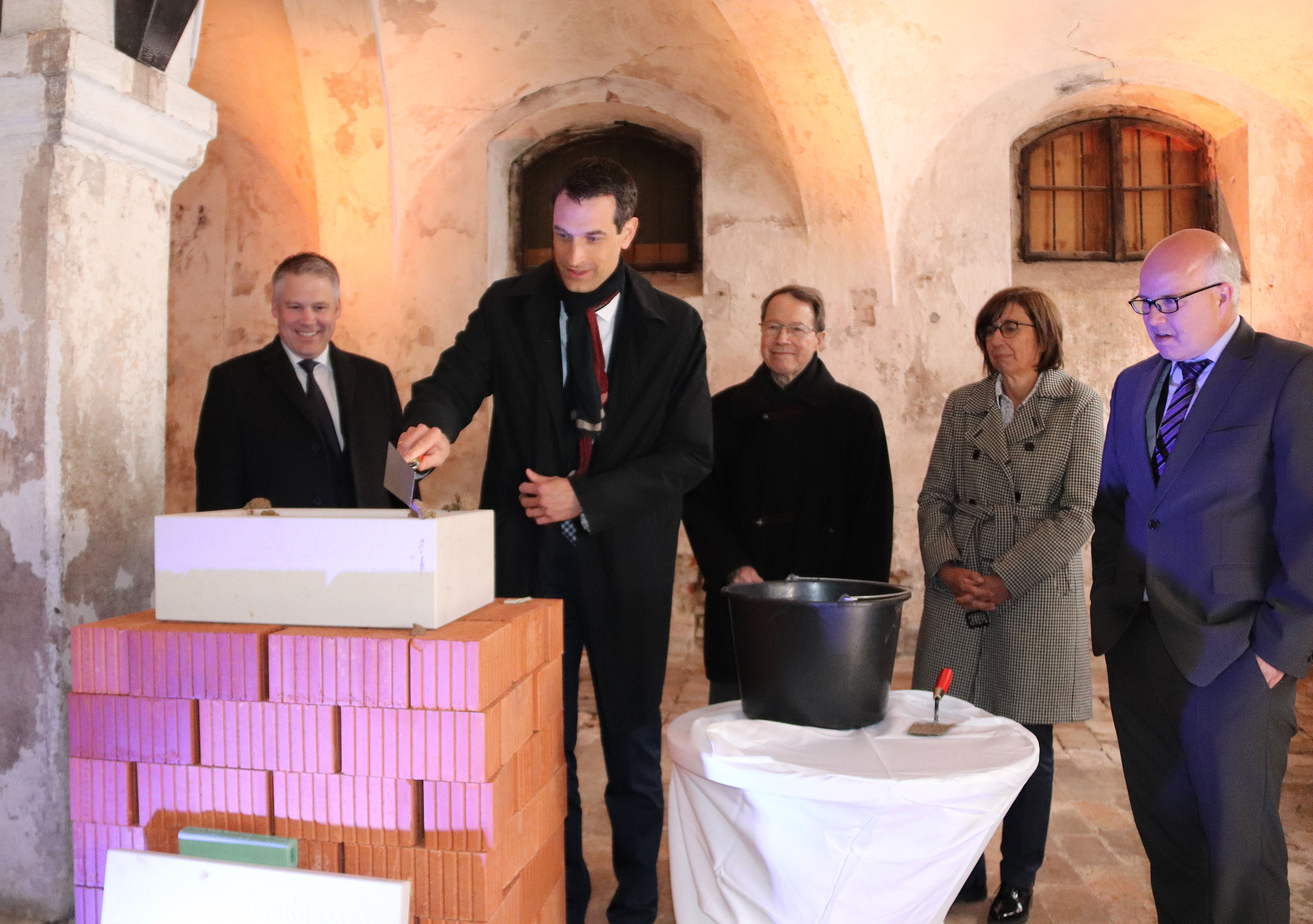 Vizepräsident Prof. Dr. Jens Hogreve betätigt sich als Maurer bei der Befüllung einer Zeitkapsel im Georgianum. Unterstützt wird er von OB Christian Lösel (links), Alt-OB Peter Schnell, Stadtbaurätin Renate Preßlein-Lehle und Nicolai Fall, Geschäftsführer der städtischen INKoBau (Foto: upd/Maillard)