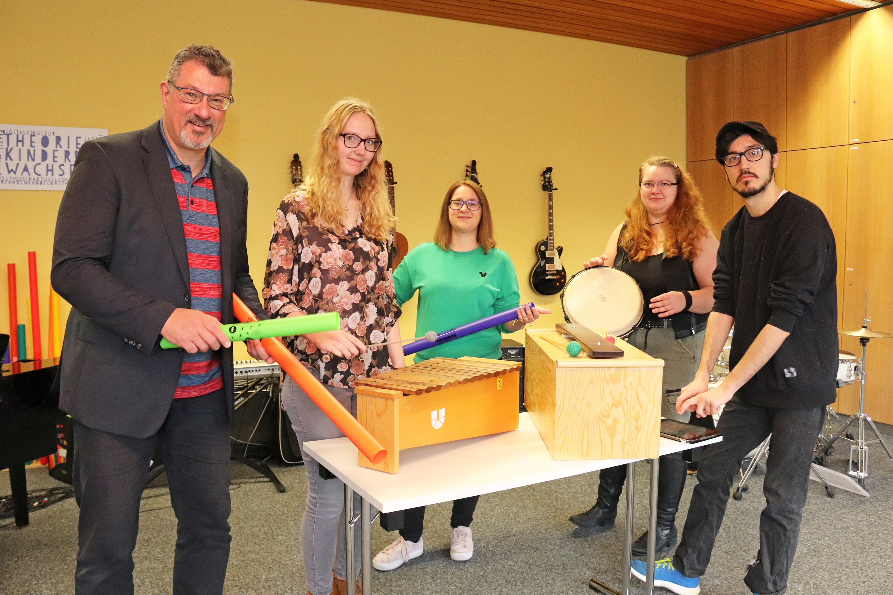 (v.l.) Jörg Edelmann sowie die Studierenden Katharina Hartl, Linda Breit, Denise Pirkl und Pablo Schenkel richten sich mit ihren Projekten an alle Musikbegeisterten in der Region Eichstätt – unabhängig von Vorkenntnissen und Alter. (Foto: Schulte Strathaus/upd)