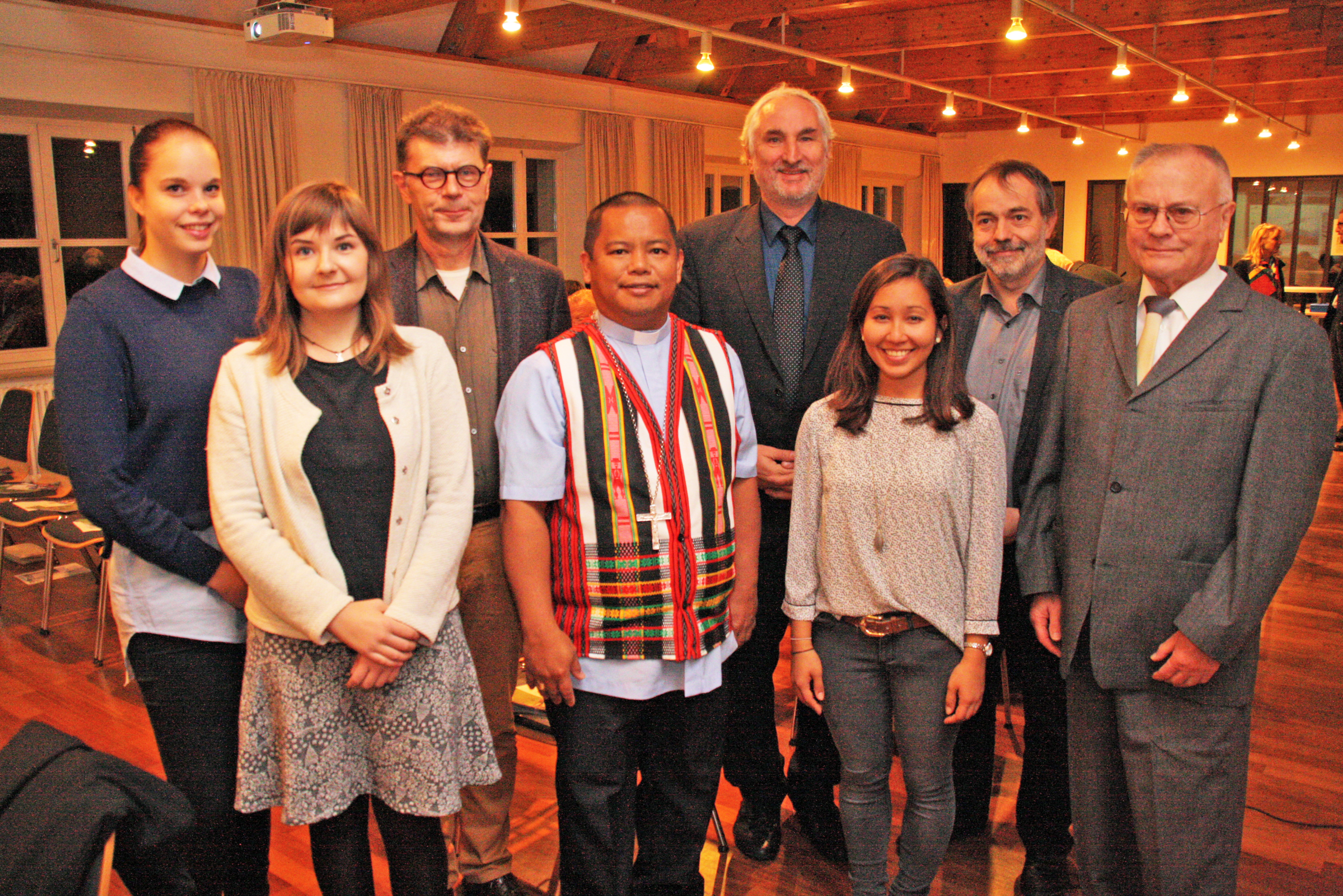 Prof. Dr. Engelbert Groß (rechts im Bild) warb unter anderem im Jahr 2016 bei der Vortragsreihe „Laudato Si' - Die päpstliche Enzyklika im Diskurs für eine Große Transformation“ für das Wiederaufforstungsprojekt in Manila. Als Gast von „missio“ und des Referates Weltkirche im Bistum Eichstätt berichtete bei der Veranstaltung auch der philippinische Bischof Valentin Cabbigat-Dimoc (vordere Reihe, Mitte) über öko-soziale Fragen in seiner Heimat. (Foto: Schulte Strathaus/upd)