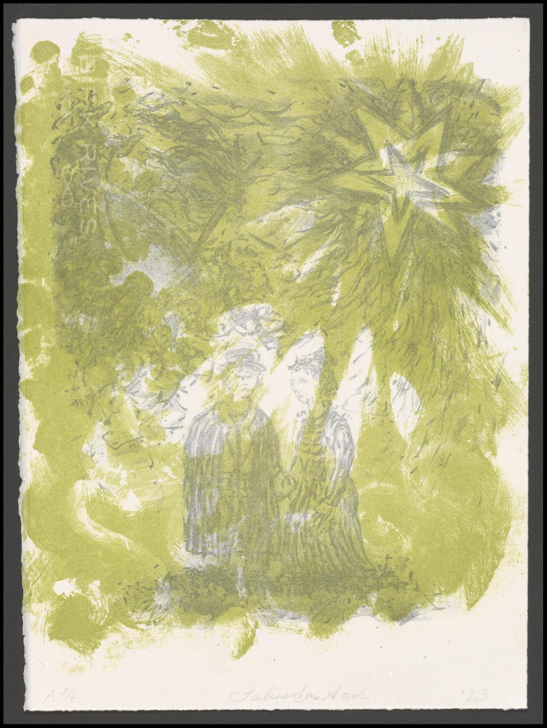 Lithographie (Kreide, Seife), zweifarbig; 38 x 28,4 cm (Blatt). - Von der Künstlerin auf der Rückseite mit Bleistift bezeichnet, auf der Vorderseite datiert, numeriert (A 1/4) und signiert. - MIT DIGITALAUFNAHME